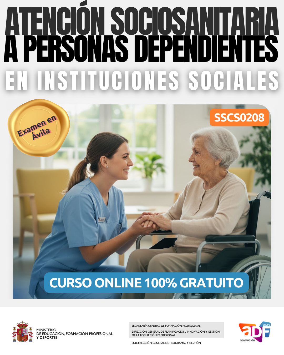 Esta apertura responde a la urgente necesidad de profesionalización en el ámbito de la dependencia. Para ello, ADF Formación lanza la convocatoria del Certificado de Profesionalidad (SSCS0208) Atención Sociosanitaria a Personas Dependientes en Instituciones Sociales. Se trata de una titulación oficial indispensable para trabajar como gerocultor o cuidador en residencias, centros de día y pisos tutelados, roles fundamentales en una sociedad cada vez más longeva.