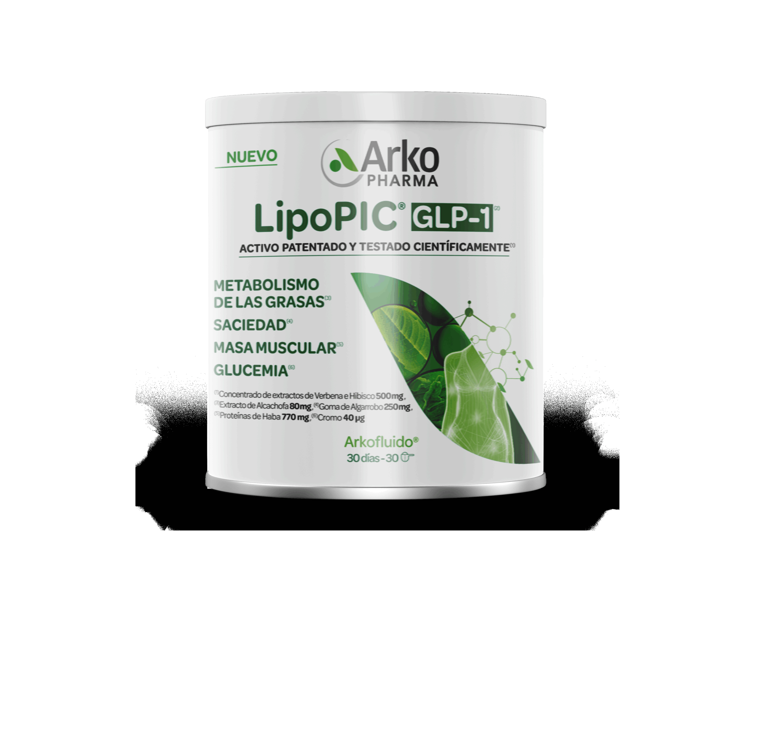 Arkofluido LipoPIC GLP-1® está indicado tras un tratamiento con análogos del GLP-1. Aumenta en un 50% la sensación de saciedad, mejora el perfil lipídico y reduce la hipertensión arterial. Se trata de un concentrado de Alcachofa, Goma de Algarrobo, Cromo, Proteína del Haba y extractos de hoja de Verbena y flor de Hibisco